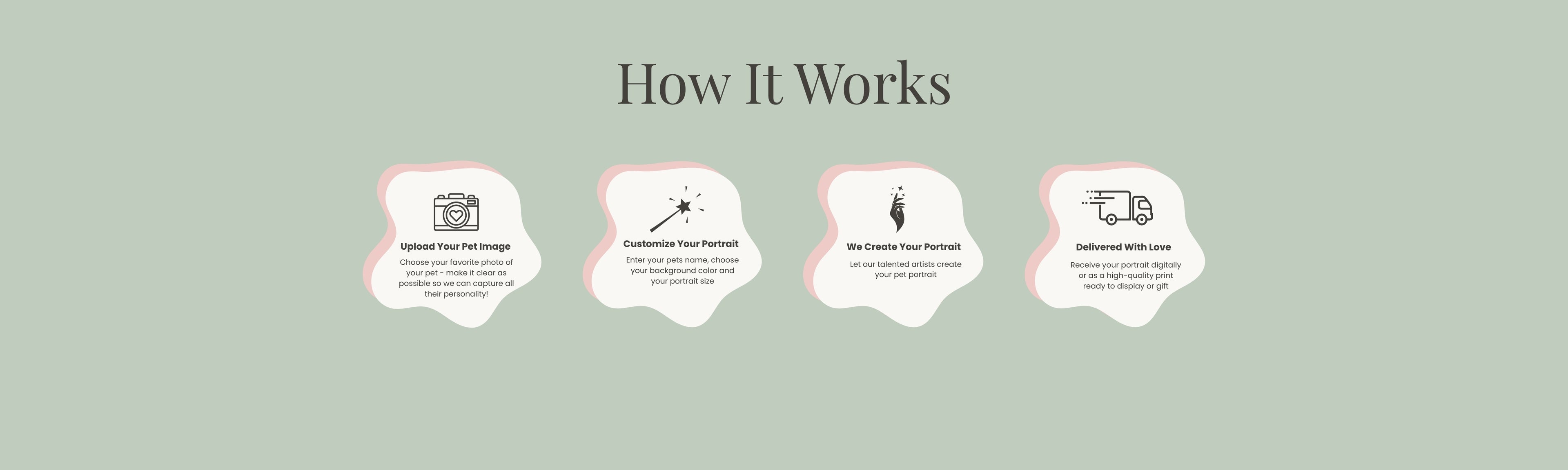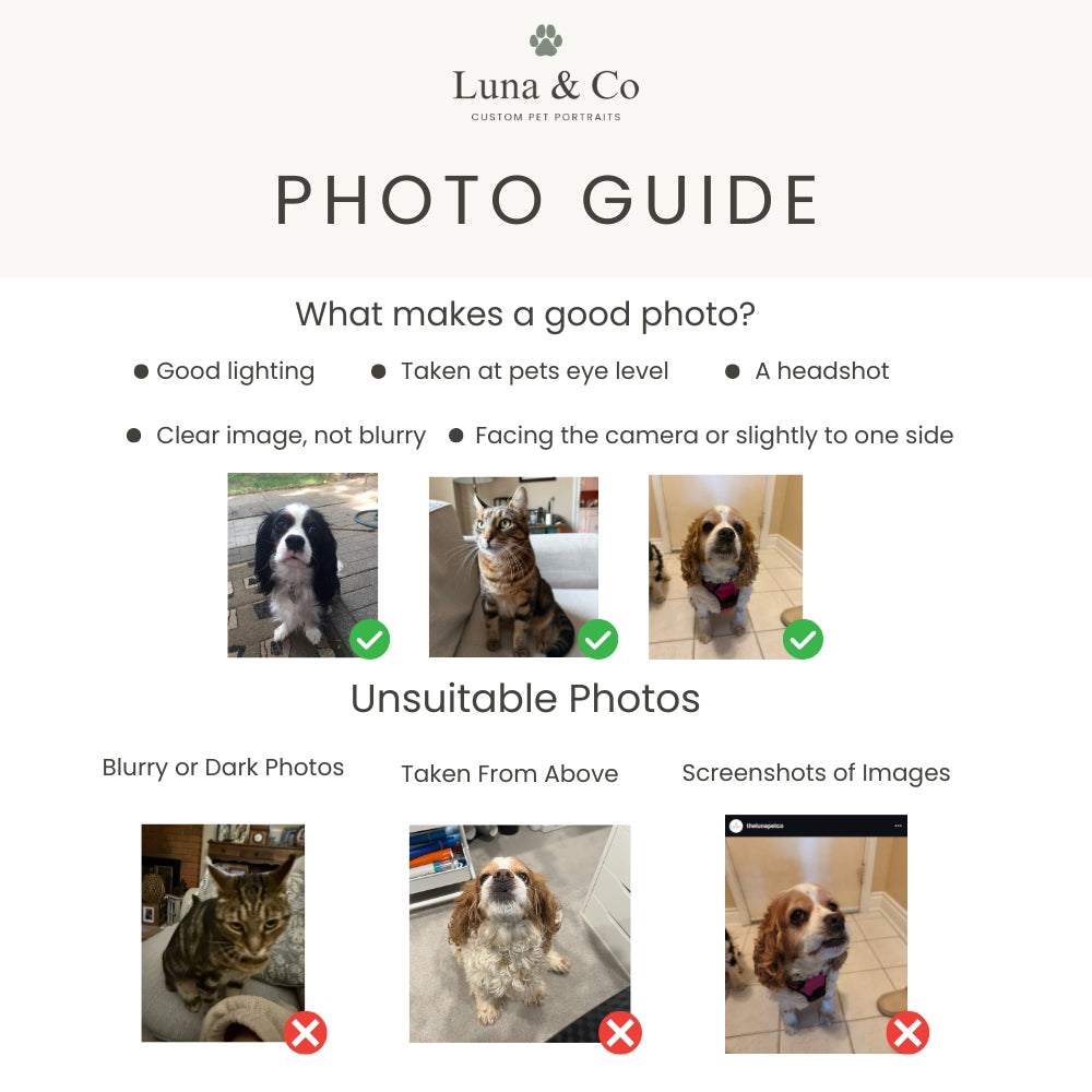 Each portrait is one of a kind. We don’t use templates; every piece is hand-illustrated (by a real artist) based on your pet’s photo.
